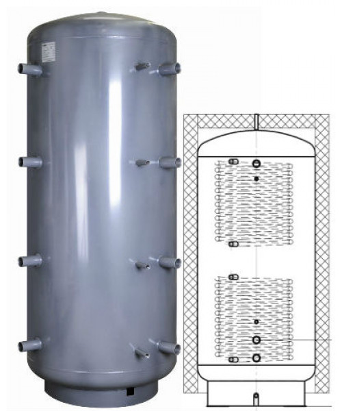 | Комплектація | теплоакумулятор з вбудованим нижнім і верхнім теплообмінниками ціна без ізоляції |