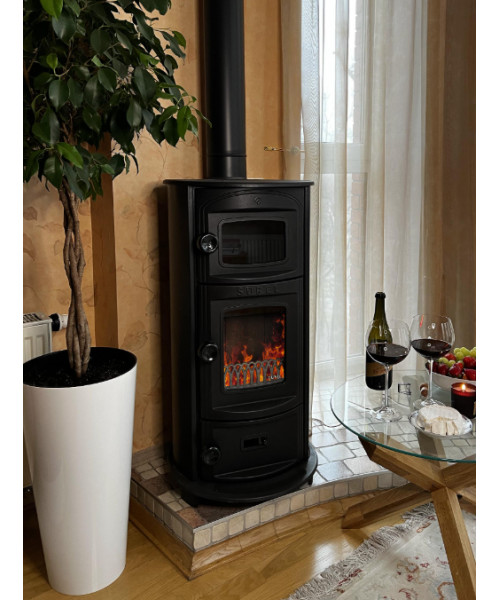 Піч оснащена великою камінною топкою зі склом SCHOTT (Німеччина), має значну масу, що забезпечує високу теплоємність та ККД. Працює на різних видах твердого палива — дровах, брикетах, пелетах та навіть висококалорійному вугіллі. Функціональна духовка та чавунна конфорка дозволяють готувати, випікати та сушити продукти. Підходить як для опалення будинків до 100 м², так і як декоративний або HoReCa-елемент.