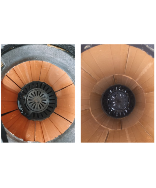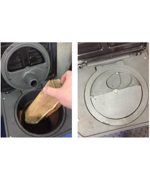 Завдяки конструкції піч працює майже у піролізному режимі: забезпечується повне згоряння палива, вторинний допал за участю чавунного «равлика» та стабільна тривалість горіння до 8 годин у режимі тління. Велика циліндрична топка (45×23 см) повністю корисна за об’ємом і підтримує режим верхнього горіння.