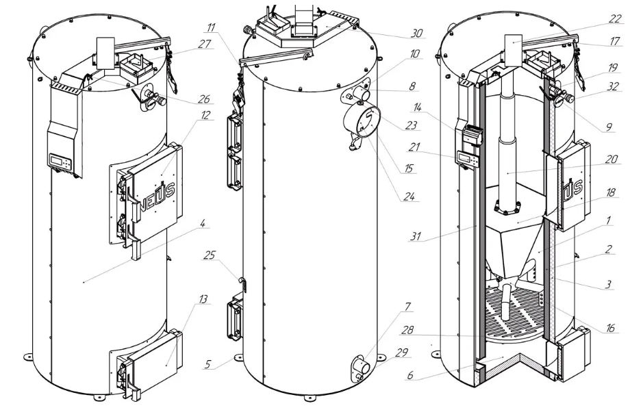 | 2. Водяна оболонка | 13. Дверцята ревізійні | 24. Шибер |