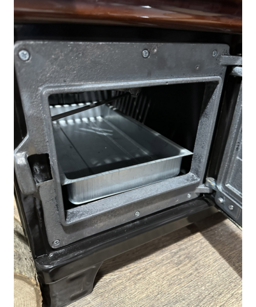 Духовка оснащена регулюванням тепла та комплектується круглим емальованим підносом. Зовнішній сталевий корпус покритий трьома шарами керамічної емалі у стилі майоліки (під кахель), чудово випромінює тепло та довго зберігає естетичний вигляд.